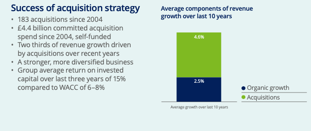 This infographic provides a compelling snapshot of the success behind Bunzl’s acquisition strategy, visually demonstrating that acquisitions are the company’s primary growth engine. The chart clearly breaks down the last decade of revenue growth, showing that acquisitions contributed an average of 4.6% annually, significantly outpacing the 2.5% from organic growth. This powerful visual is backed by impressive statistics detailed on the left, including over 183 self-funded deals since 2004 and a return on invested capital that substantially exceeds the company’s cost of capital, underscoring the effectiveness and financial discipline of their serial acquirer model.