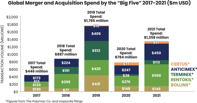 This chart visualizes the intense M&A competition among the “Big Five” pest control firms from 2017-2021, clearly positioning Rentokil Initial (light green) as a dominant serial acquirer in the years preceding its landmark acquisition of rival Terminix.